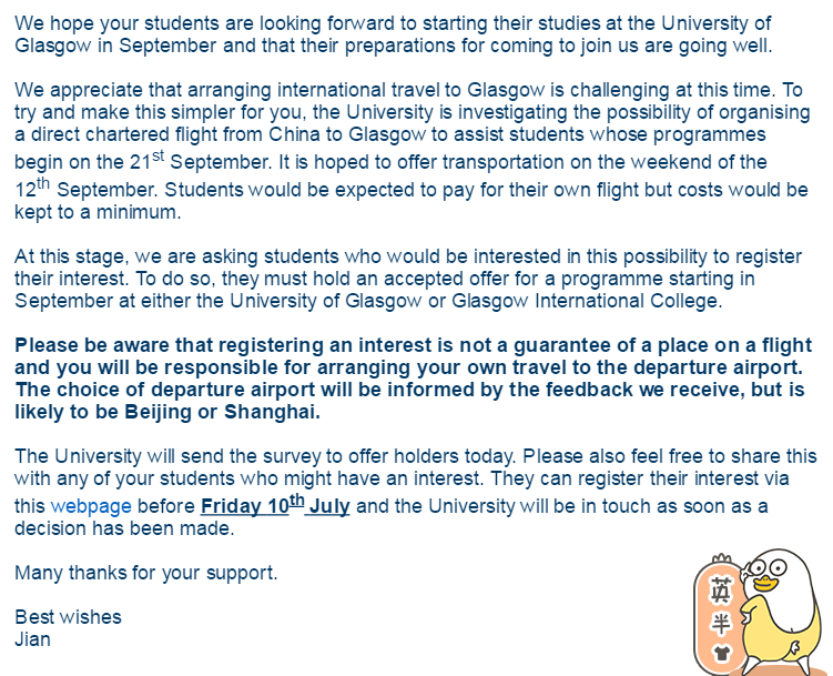 在这个阶段, 大学 要求对 此 感兴趣的学生 进行登记 。 登记的学生 必须 已经接受格拉斯哥大学或格拉斯哥大学学院 9月 开学的OFFER。