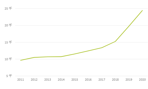 比去年增加4670 人 同比增加23% 是2016年的 2倍