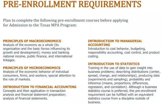 德克萨斯大学奥斯汀分校的会计硕士项目共有3种培养模式。Traitional-MPA各种背景的本科学生都可申请。Integrate MPA 和ECON-MPA适合本校学生申请,其中Integrate MPA专为商学院本科学生设计,ECON-MPA项目则是适合本校想获得经济学学士和会计硕士的在读学生申请的本硕连读项目。