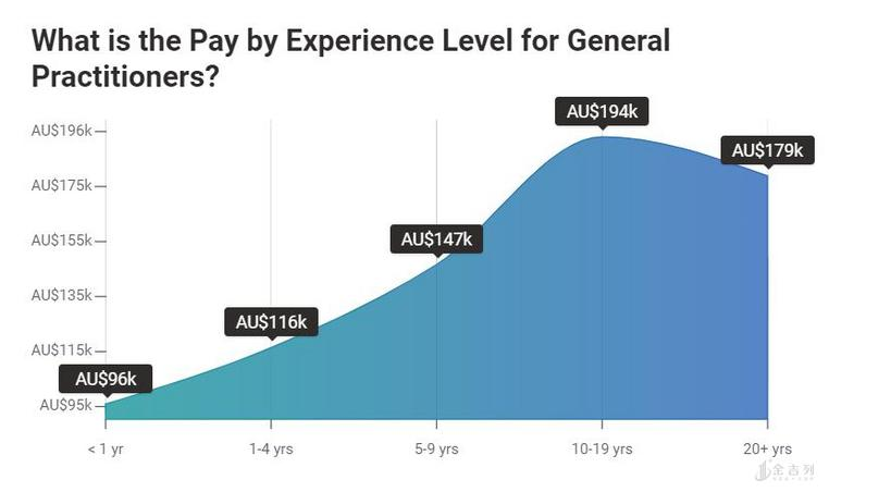 澳洲临床医生的薪资也是杠杠滴,以基础的General Practitioner (GP) 即全科医生为例,薪资如下图所示,起始年薪在96000澳币左右(约合人民币44万),工作1-4年就能达到116000澳币年薪(约合人民币53万),工作5-9年就能达到147000澳币年薪(约合人民币67万)。