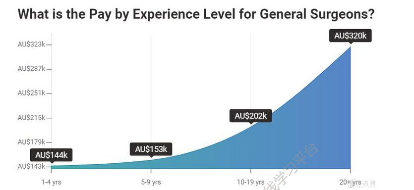 而General Surgeon即外科医生的薪资就更高了,如下图所示, 工作1-4年 年薪就能达到144000澳币左右(约合人民币66万)。而且,医生也是澳洲非常紧缺的移民职业。