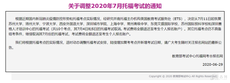 在ETS昨天公布的复考通知中,中国科技大学考点位列其中,但最新通知,中国科技大学考点尚且不具备组考条件,7月暂时无法复考,调整为中国矿业大学。目前,ETS正在与教育部考试中心积极沟通,已确定在上述部分已恢复的考点新增七月份的考试日期,以及在其他考点恢复后增加新的考试日期。目前TOEFL iBT 7月开放考试日期详情如下: