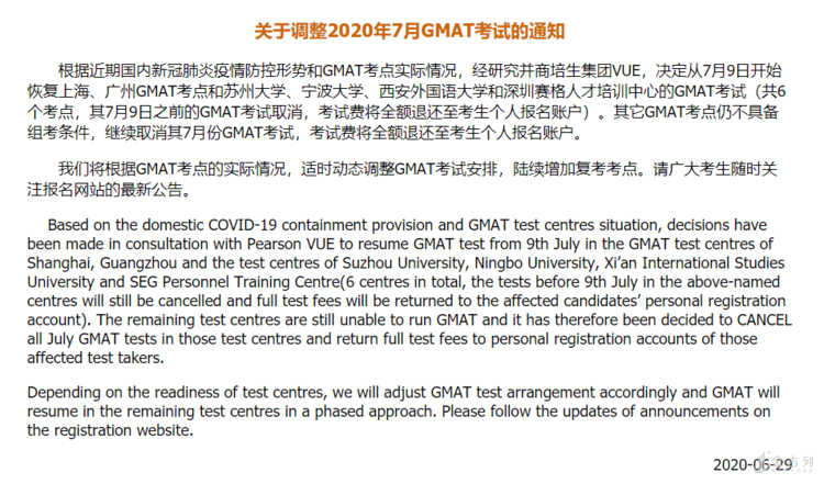 根据近期国内新冠肺炎疫情防控形势和GMAT考点实际情况,经与教育部考试中心商议及研究,决定从7月9日起开始恢复以下考点的GMAT考试: