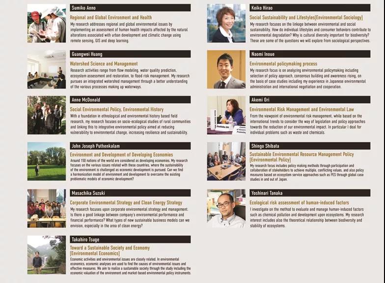 - 接下来为大家介绍上智大学英文授课项目—地球环境研究科(Grauate Schoolof Global Environmental Stuies)研究生申请! 上智大学院地球环境研究科以复杂的地球环境为研究对象,倡导用【文理融合】的研究理念来解决环境问题,于2005年4月设立。将社会科学和自然科学相结合,进行更高层次的研究和教育。教师由法学、经济学、政策学、经营学、社会学、理学、工学等多种领域的国内外专家组成,外聘讲师则是目前引领日本环境研究的一线研究者。 除了日语课程外,还设置了仅用英语进修的国际环境课程,招收来自世界各地的众多留学生。因此,在地球环境学研究科,可以根据自己的问题和关心,接受具有全球视野的高水平的教育和指导。 部分课程设置: 环境法、环境经济学、环境政策、环境工程、环境管理学、环境生态学、人类健康环境科学、环境污染的生态风险、公共卫生和环境、国际环境法、生态经济学、环境行政论、回收利用工程、环境金融学、环境社会学、发展中国家的发展和环境、环境伦理、环境研究的前沿、能源和环境、环境管理、性别和环境、环境教育、环境研究的统计学。