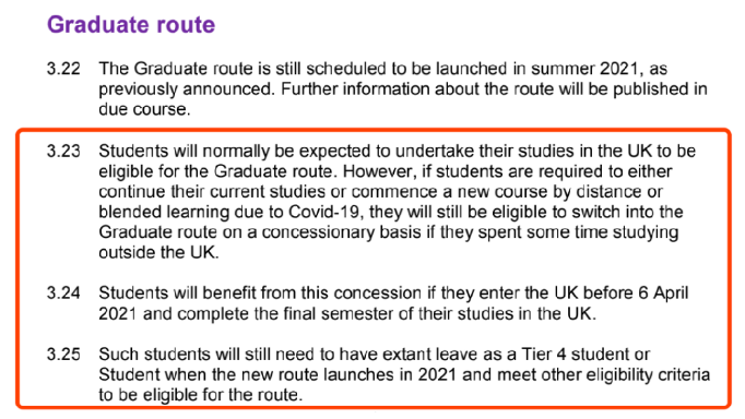 并且非常人性化的考虑到,由于疫情的原因,在英国境外以远程教育的方式进行学习的毕业生也有资格申请Grauate Route。