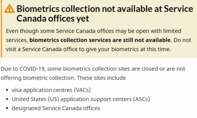 联邦政府官网提示:即使现在部分Canaa Service办公室已经重新开启,但是生物信息采集服务尚未开放。请公众暂不要去相关办公室提交生物信息。