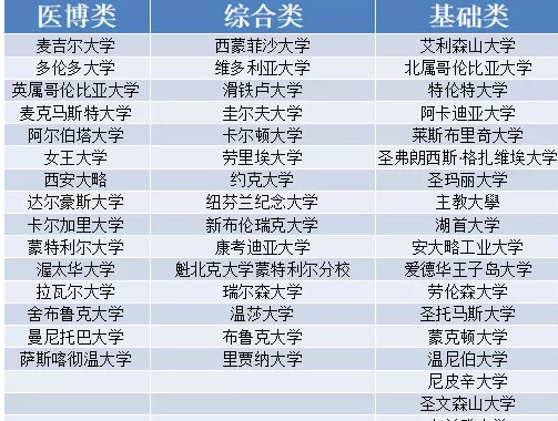 但学生和家长都希望有一个途径了解大学,《麦克林》杂志基于这两方面的考虑,将大学依据研究资金、提供课程的多样性、研究生及职业课程的范围,将加拿大大学分成三类——基础类大学、综合类大学、医博类大学。
