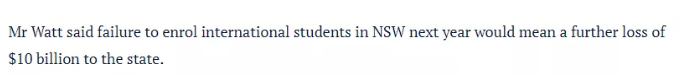 Watt表示,明年不招收国际学生到新州,将进一步带来100亿澳元的损失。