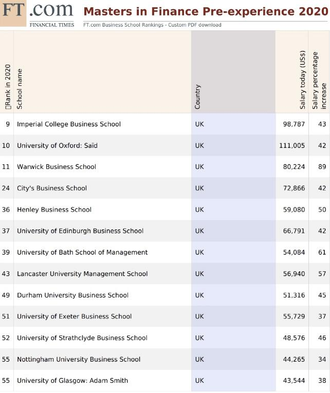 无需工作经验金融硕士排名共56所商学院上榜,英国商学院占13所。