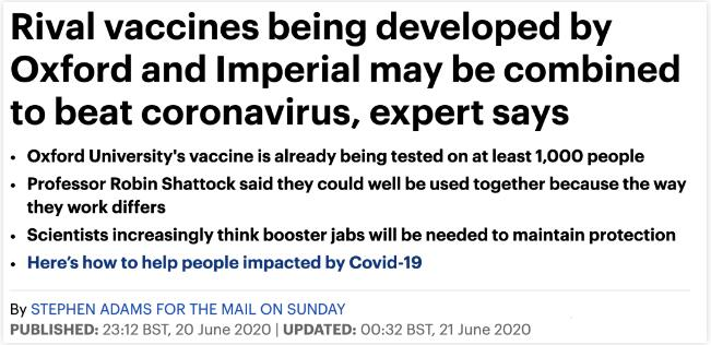 因此,帝国理工疫苗团队负责人Robin Shattock就提议说,两种疫苗可以搭配使用,考虑到牛津疫苗的试验速度要快一些,可以先注射牛津的疫苗,之后再注射帝国理工的疫苗,以便提供更长期限的免疫时间。