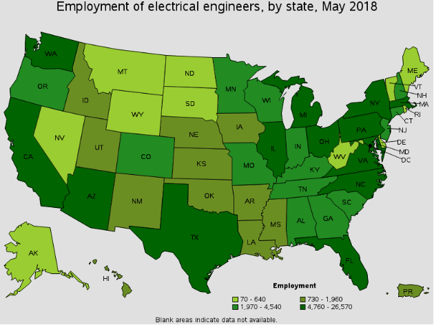 在美国,EE专业人才的需求量其实一直都处于空缺状态,从2018年EE的就业数据来看,留学热门大州诸如 纽约州,麻州,加州,德州等对EE的人才需求量都比较大。