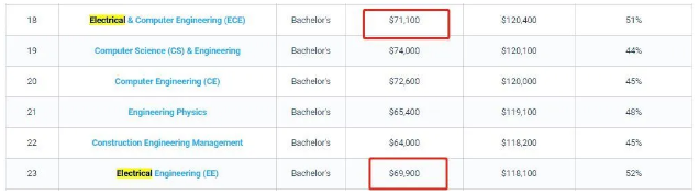 根据美国薪酬网站payscale统计,ECE电子和计算机工程专业本科毕业生 平均起薪达到了71300美元 ,而中期薪资达到了122300美元;EE电气工程专业本科毕业生平均起薪达到69900美元,硕士毕业起薪还会再高一些。