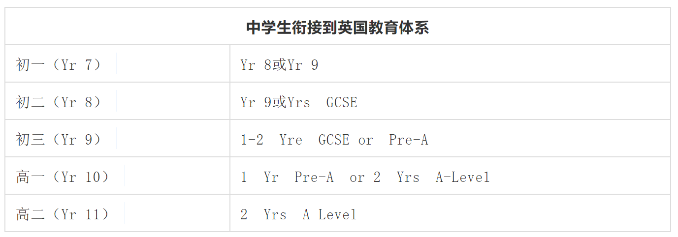 在英国,16 岁的学生需要参加普通中等教育证书( GCSE )考试。考试结果分为 A* - G 各个等级,得到五个 A* - C 结果的学生通常会继续学习两年,选择三门或以上的 科目课程进行学习并参加高级水平考试 (A-Level) 。本科院校将根据学生A-Level考试的结果进行录取。顶尖的大学会根据GCSE和A-Level两项考试的成绩来决定录取。因此,中国的初二或初三学生通常被建议修读 GCSE 课程,高一或高二的学生建议入读 A-Level 课程,具体视学生的年龄,学习成绩和英国学校的入学要求而定。