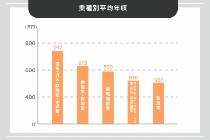 在日本赚得最多的是电气·燃气·供热·水利业,平均年收入747万日元(约49.4万人民币);其次是金融·保险业,平均年收入615万日元(约40.6万人民币);紧追其后的是情报通信业的599万日元(约39.5万人民币)。第四和第五分别是教育业510万日元(约33.7万人民币)和制造业507万日元(约33.4万人民币),相差不过3万日元。