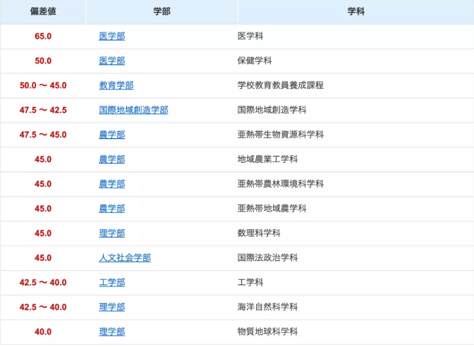 从该表可以看出,虽然琉球大学是国立大学,但是除了医学部以外,偏差值都在50以下。其他国公立大学,也有不少像这样偏差值低于50的学部。