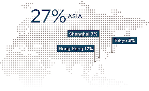 27%应届生在亚洲就业,其中香港17%,上海7%,东京3%。