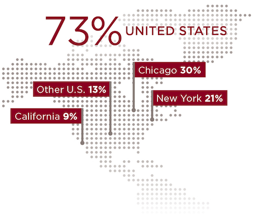 73%应届生留在美国就业,其中30%在芝加哥,21%在纽约,9%在加州,13%在美国其他地区。