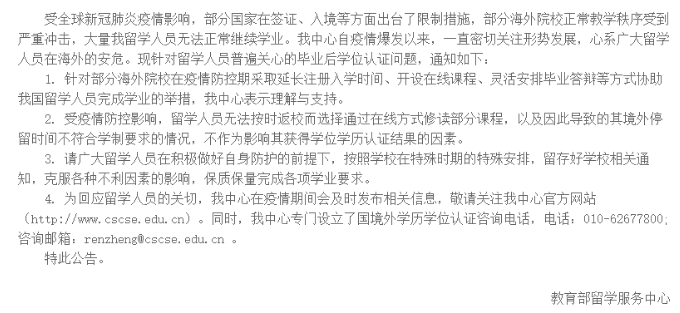 我国教育部留学服务中心自疫情爆发以来,一直密切关注形势发展,心系广大留学人员在海外的安危。并针对留学人员普遍关心的毕业后学位认证问题,做出回应!