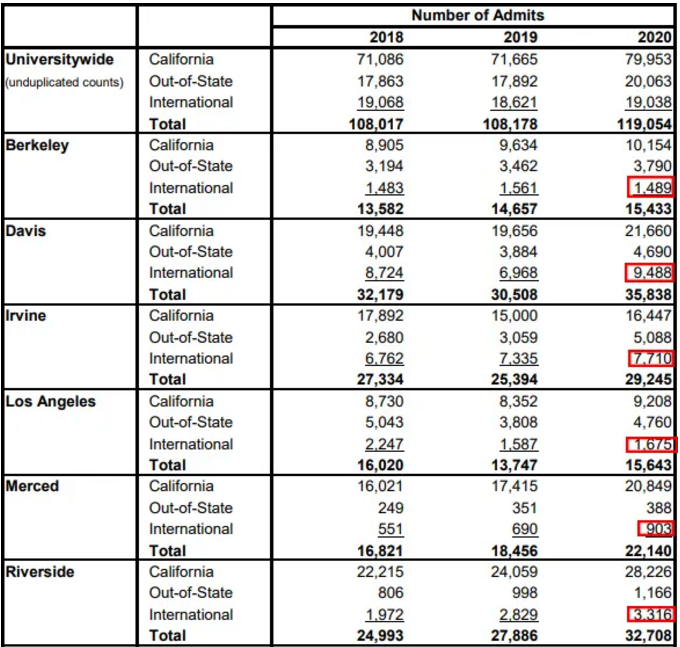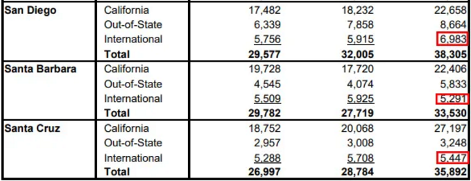国际新生申请数: UCSD>UCLA>UCI>UCB>UCSB>UCD>UCSC>UCR>UCM