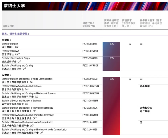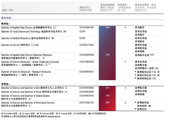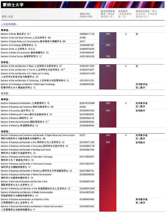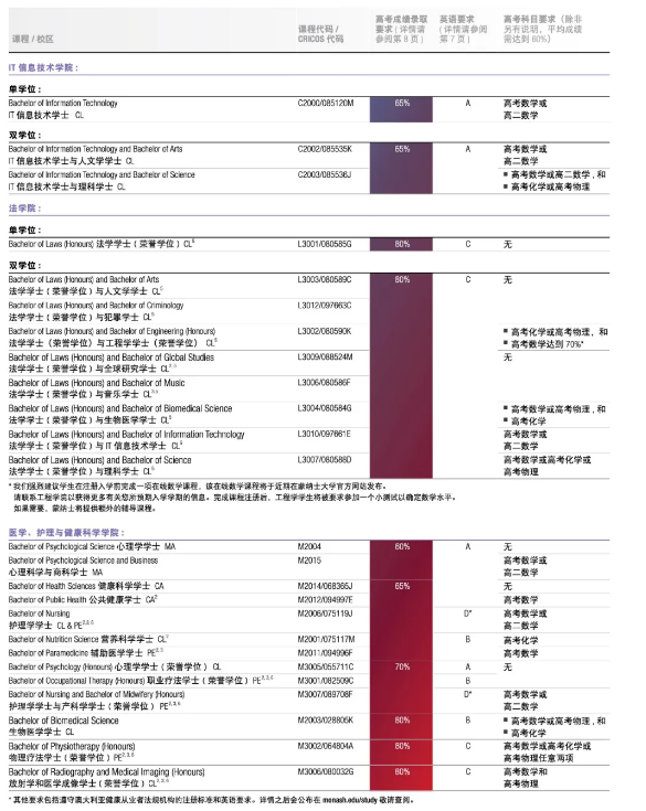 以下蒙纳士大学的课程接受高考成绩