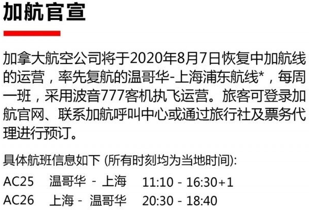 加拿大航空官方公众号于昨晚发布消息,宣布将于2020年8月7日恢复中加航线的运营,率先复航温哥华至上海浦东航线,每周一班。航班将技术经停首尔仁川机场。