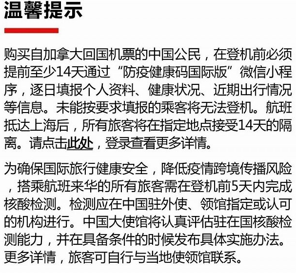 同时,加航的复航通知也提醒赴华的所有乘客,需在登机前5天内完成核酸检测。检测应在中国使、领馆指定或认可的机构进行。