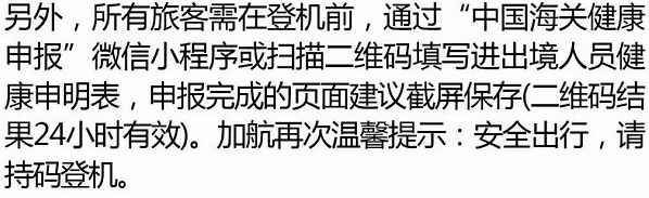 登机前,需通过“中国海关健康申报”微信小程序或扫描二维码填写进出境人员健康申明表。