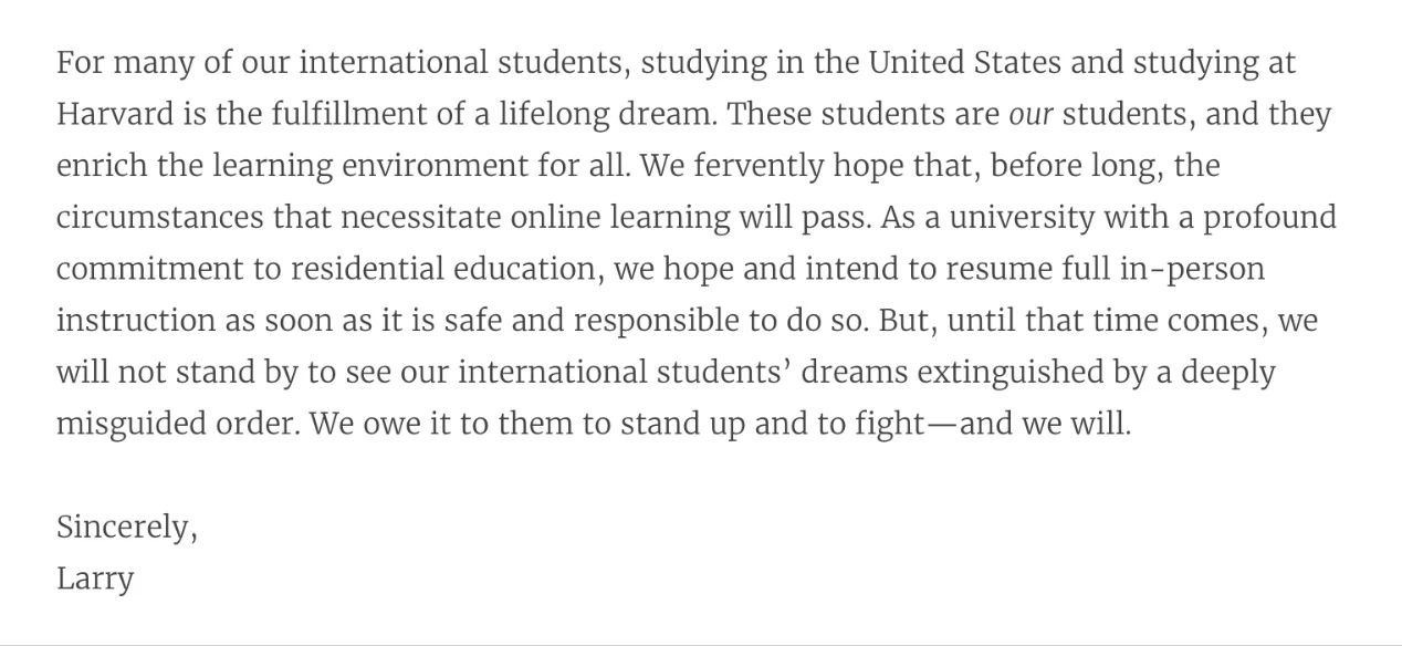 “对于很多我们的国际学生而言,留在美国、在哈佛大学学习是他们毕生的梦想,也恰恰是这些国际学生的存在让我们整体的学习环境得到充实。我们 不会袖手旁观 ,我们应当,也一定会 为了他们站起来,去战斗。 ”