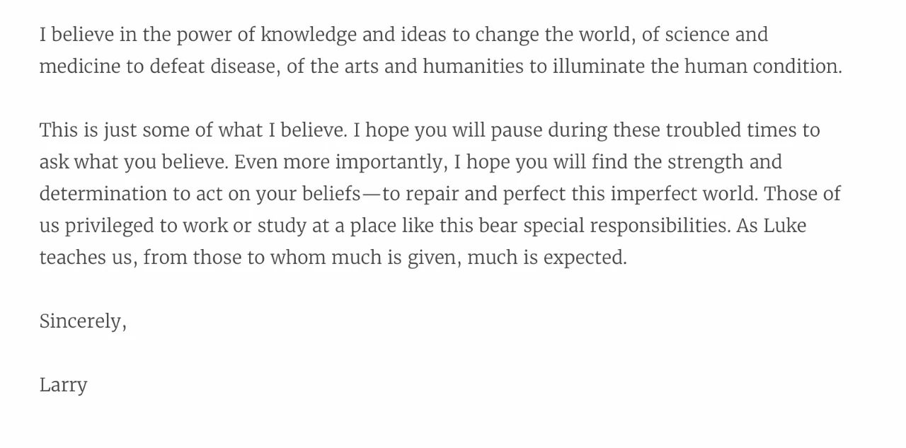 “我相信,知识和思想能够改变世界,科学和医学可以战胜疾病,艺术和人文科学可以照亮文明……我希望你们能在这些困难的时期能够停下来,问问自己相信的什么。更重要的是,我希望你们能够有力量和决心按照自己的信念行事——修复和完善这个不完美的世界。”