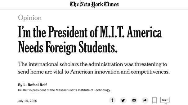 同日,mit校长l.rafael reif在纽约时报上发表文章,呼吁美国政府善待中国留学生。