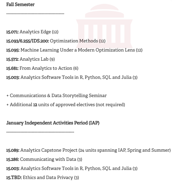 与MIT运营研究中心 (一个跨学科研究中心,于1953年建立)共同建立的MBAn计划专为计划在数据科学行业从事职业以及正在寻求职业发展或改变的人而设计的当前学生或刚毕业的大学毕业生,尤其是工程师,数学家,物理学家,计算机程序员和其他高科技专业人员。该计划满足了行业对技能娴熟的毕业生的需求,这些毕业生可以应用数据科学解决业务挑战。麻省理工学院提供本科,研究生和博士级别的分析学位。