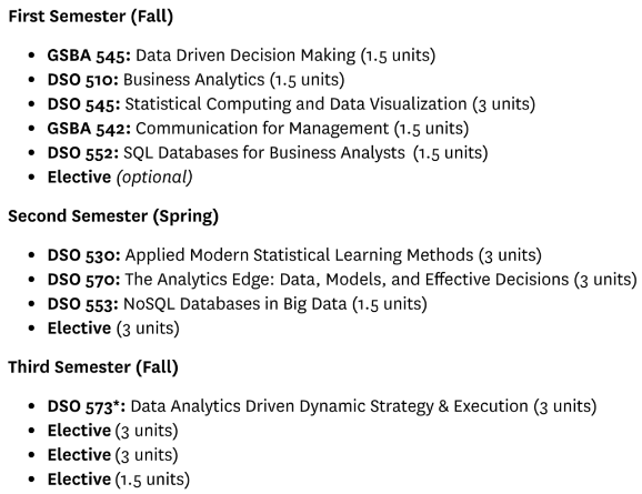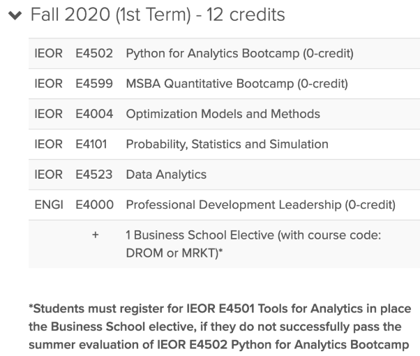 MSBA课程是一个为期三个学期的课程,可以在一个年内完成。学生进入秋季学期,可以在下一个八月尽快完成,或者参加暑期实习以在下一个秋季末完成课程。学生必须在以下领域修读相当于12门三学分的课程(36学分) IEOR部门的哥伦比亚工程专业至少18个学分(通常为6个课程)哥伦比亚商学院至少12个学分(通常为4-6个课程)