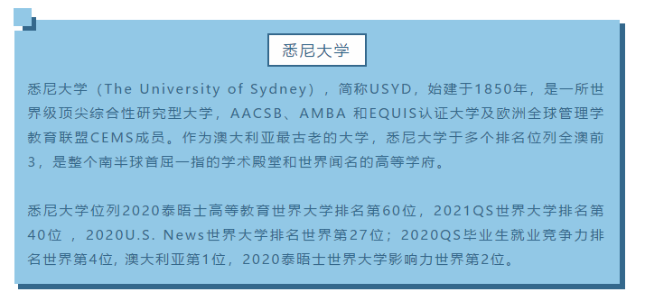 悉尼大学(The University of Syney),简称USYD,始建于1850年,是一所世界级顶尖综合性研究型大学,AACSB、AMBA 和EQUIS认证大学及欧洲全球管理学教育联盟CEMS成员。作为澳大利亚最古老的大学,悉尼大学于多个排名位列全澳前3,是整个南半球首屈一指的学术殿堂和世界闻名的高等学府。