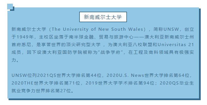 新南威尔士大学(The University of New South Wales),简称UNSW,创立于1949年,主校区坐落于南半球金融、贸易与旅游中心——澳大利亚新南威尔士州首府悉尼,是享誉世界的顶尖研究型大学 ,为澳大利亚八校联盟和Universitas 21成员,因下设澳大利亚国防学院被称为“战争学府”,在工程及商科领域具有极强实力。