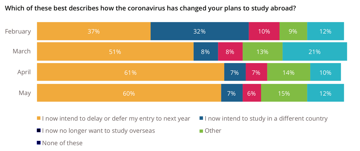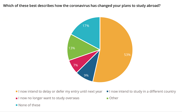 相比之下,我们可以看到现在有53%的受访者打算推迟,9%的人打算去另一个国家学习。