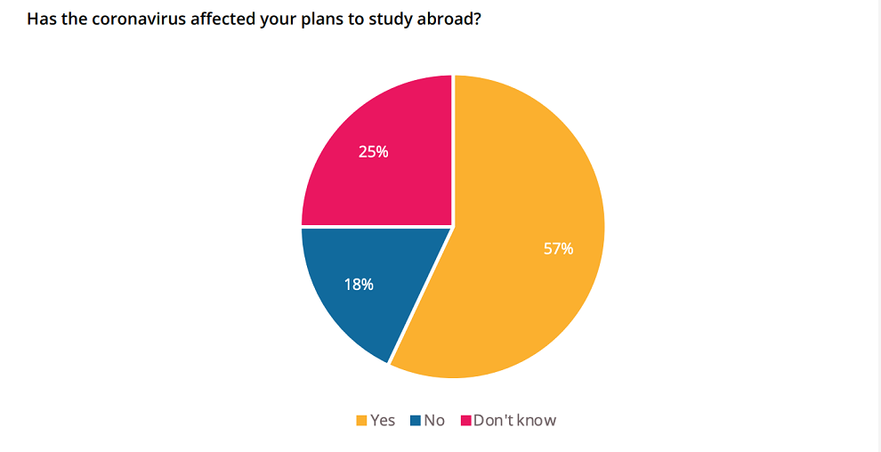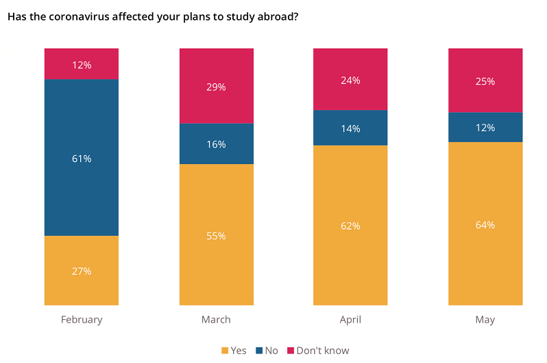在QS调查4月初发布的上一份报告中,46%的受访者表示他们的计划受到影响,29%的受访者表示没有受到影响,25%的受访者表示目前尚不清楚是否对自己的留学计划产生影响。