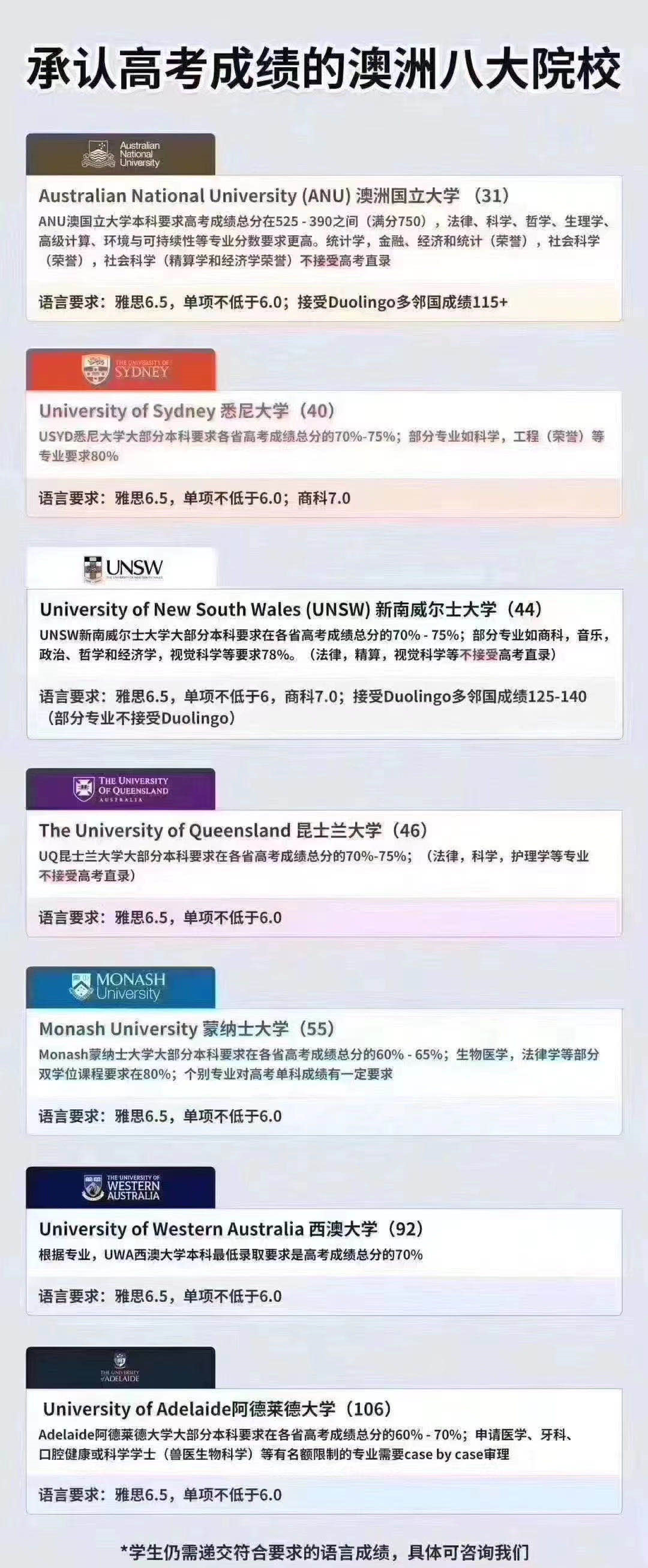 澳洲承认高考成绩,澳洲八大申请要求如下: