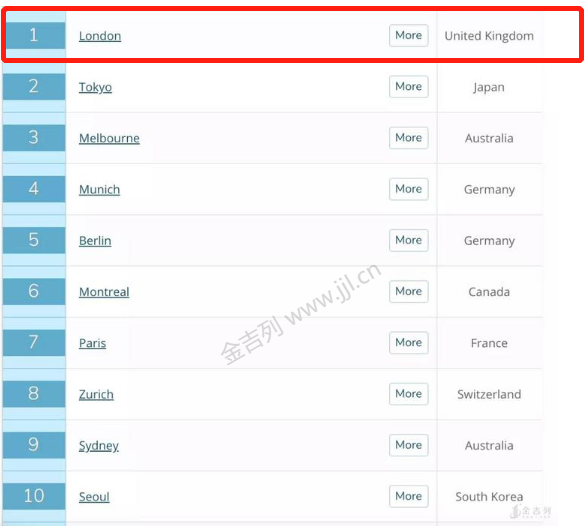 在这次排名中,前三位和去年一样,分别是 英国伦敦、日本东京和澳大利亚墨尔本 ,其次分别是慕尼黑、柏林、蒙特利尔、巴黎、苏黎世、悉尼、首尔。