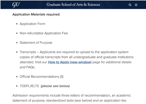 大部分排名前50的学校对于申请者的GPA要求为3.5以上,托福成绩最低要求为100分。有竞争力的申请者的GPA一般在3.8以上,托福成绩一般在105分以上。
