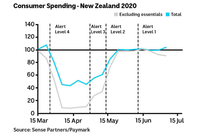 目前,新西兰已经宣布已“消灭”新冠病毒,解除四级封锁限令。在宣布接触四级封锁后,新西兰的消费支出曲线图有了大幅度的涨幅: