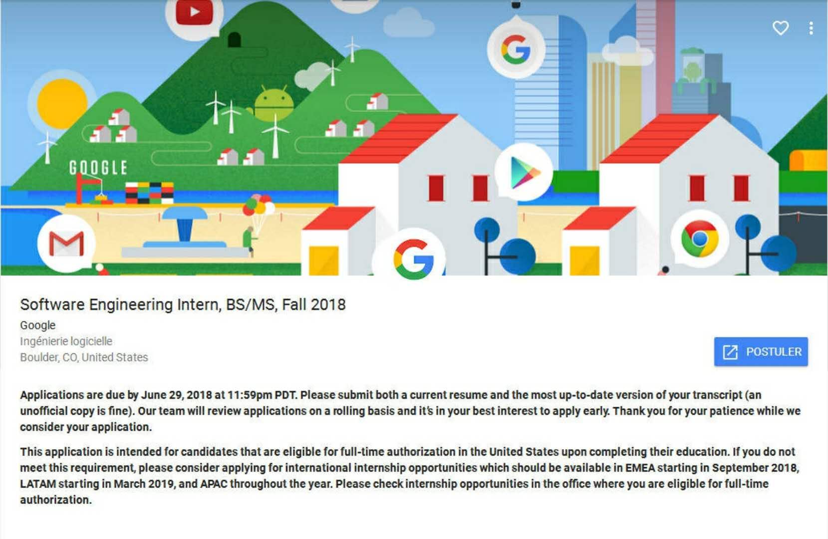 Google公司现提供2018年秋季软件工程带薪实习,申请人必须是计算机科学等相关专业的全日制本科或研究生,2019年毕业者优先,国际生可申请,可在以下地点选择实习(Mountain View, CA;Bouler, CO;Cambrige, MA;Chicago, IL;Irvine, CA;Kirklan, WA;Los Angeles, CA;New York, NY;Pittsburgh, PA;San Bruno, CA;Seattle, WA;San Francisco, CA;Sunnyvale, CA),会以下两种或以上变成语言:C、C++、Java、JavaScript、Python。实习时间约为12-14周。申请截止日期:2018年6月29日。