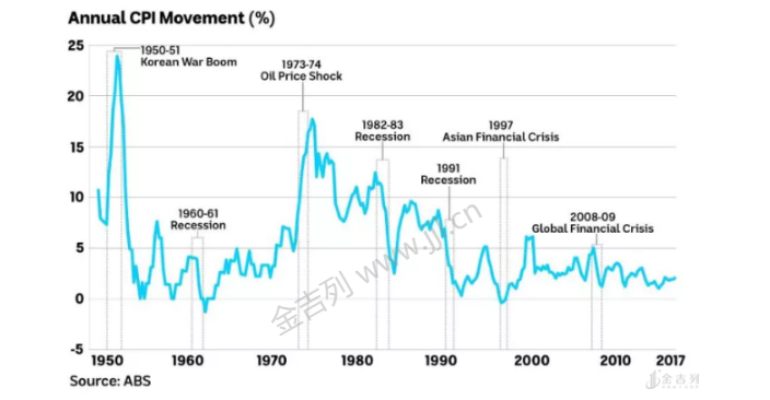 澳洲消费者物价指数第一次大跌可追溯到1948年,史上第二次最高跌幅出现在1953年12月,下跌了1.5%,当时澳大利亚刚刚退出战争,羊毛价格飙升,而羊毛是澳大利亚最大的出口商品。