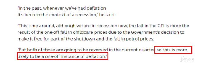 “这次,尽管我们现在正处于衰退中,但CPI的下降更多是由于政府决定在部分领域停工和汽油价格下跌,以及实行免费托幼的结果。”