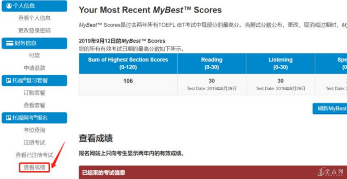 - 点击左侧“查看成绩”,最上方会显示“your most recent mybest™ scores”,即过去两年所有toefl ibt考试中每部分的最高分。