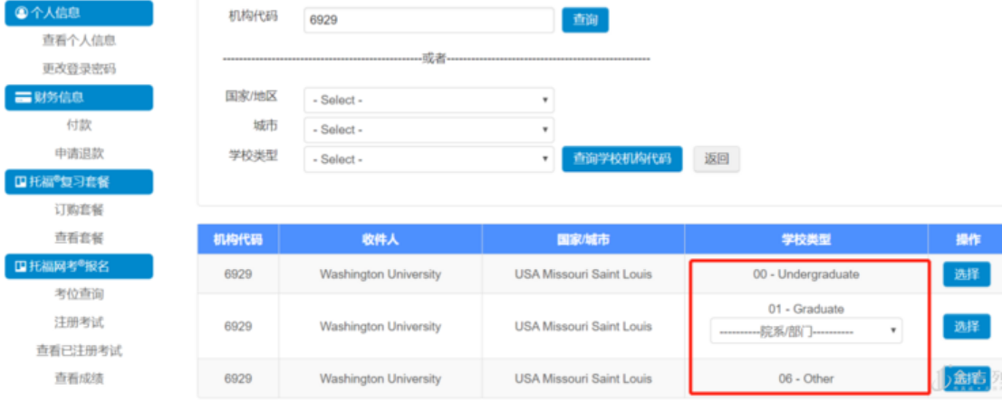 若输入学校代码查询后,有多个选项,请一定要提高警惕,慎重选择。学校类型中,有“00 - unergrauate”(本科)、“01 - grauate”(研究生)、“02 - management”(管理学院研究生)。 当学校类型为“01-grauate”时,院系为必填项。 如果学校对送分院系有明确的要求,则按照学校要求进行选择,如果学校对院系没有要求,则选择相近院系或者“99 - other epartment not liste”;