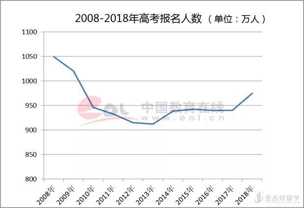 全国高考报名人数在 2008年达到历史最1050万人之后急剧下降,直至2014年起开始止跌趋稳,根据教育部统计数据全国高考报名人数连续四年稳定在940万左右,在经历四年稳定之后,2018年迎来大涨,2018年高考报名人数达到975万,较2017年增加35万,报名人数创近8年新高 。