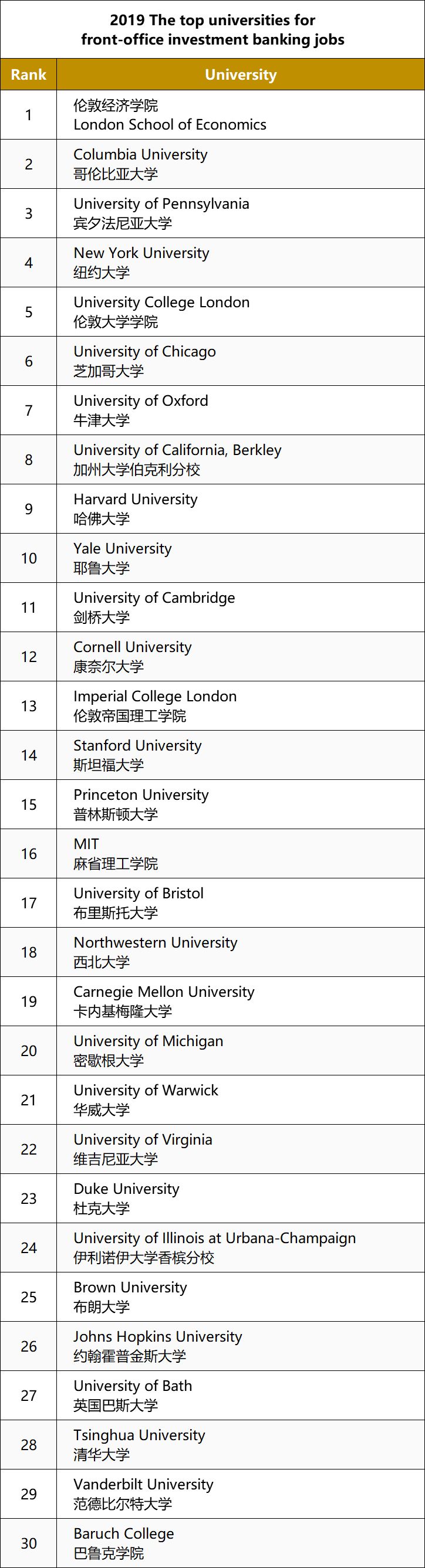 另外,有一些大学虽然有大量学生在投行工作,但因从事前台工作(所谓的前台Front Office,就是帮投行赚钱的部门,也是申请者最青睐的部门)的学生比例并不高,因此他们没有进入前10名,比如说 康奈尔、普林斯顿、MIT 。