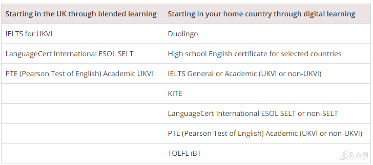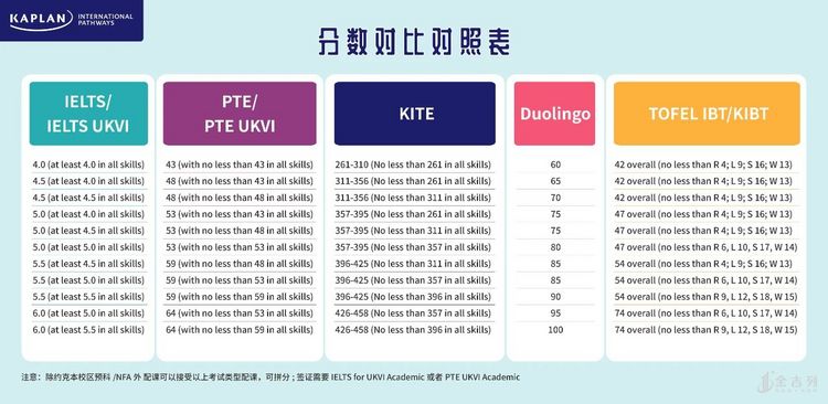 目前Kaplan英国预科接受下图中的语言成绩进行配课申请(诺丁汉大学国际学院NFA课程和约克大学国际预科学院课程有特殊规则请咨询招生经理确认),但是签证申请需要IELTS for UKVI,PTE Acaemic UKVI或者 LanguageCert International ESOL SELT 。