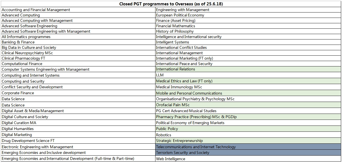 同学们关注起来,KCL一直都是大家踊跃申请的名校,截止到6.25日,以下2018年开设的研究生课程全部关闭: