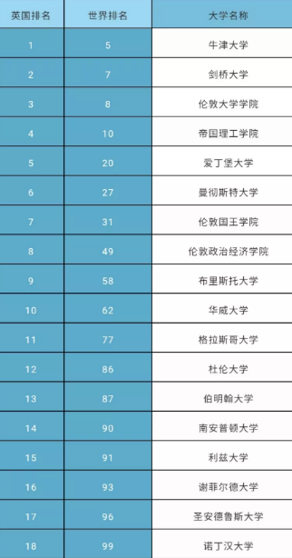 以下是2021年进入QS世界排名TOP100的英国大学名单: